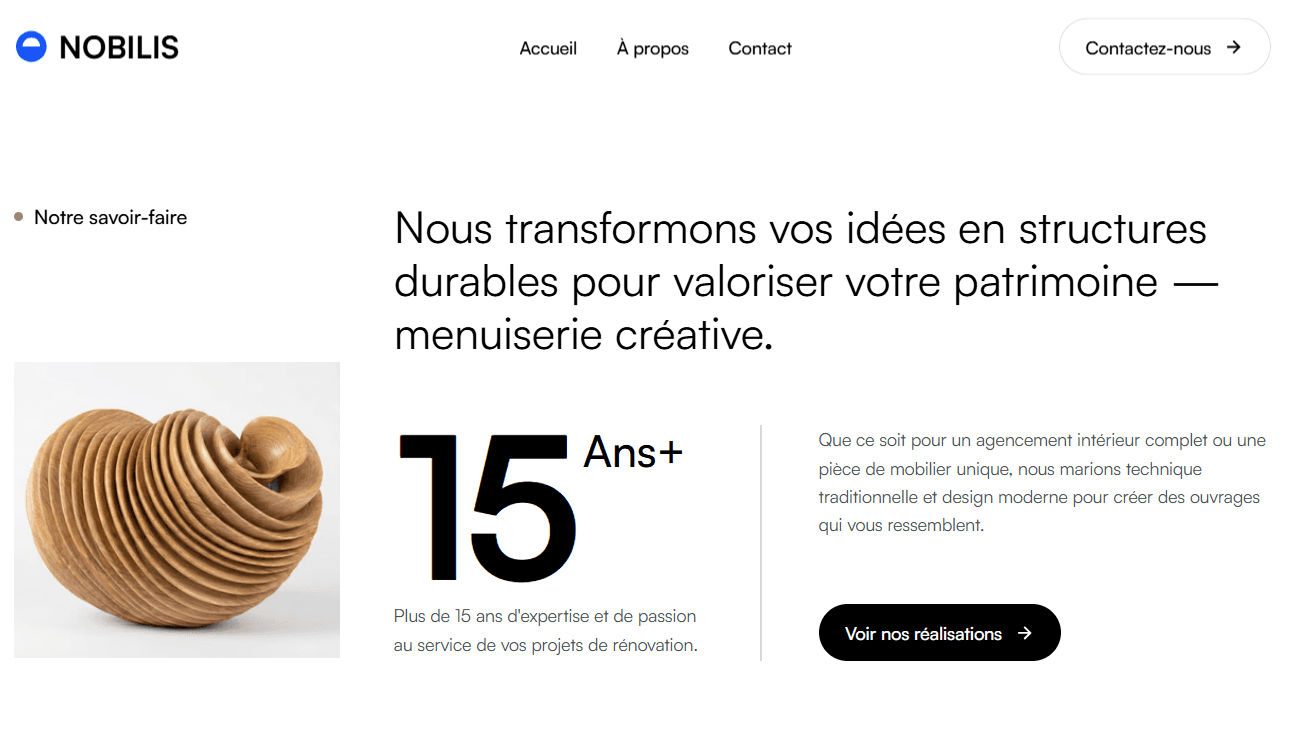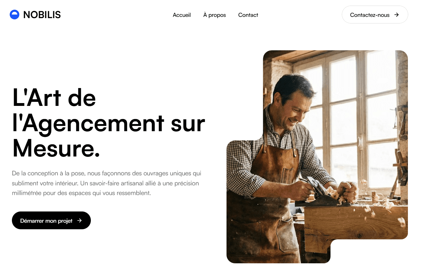 Nobilis Bois incarne l'excellence de l'agencement sur-mesure. J'ai conçu pour eux une vitrine digitale minimaliste qui laisse la parole à la matière, transformant chaque visiteur en prospect qualifié.